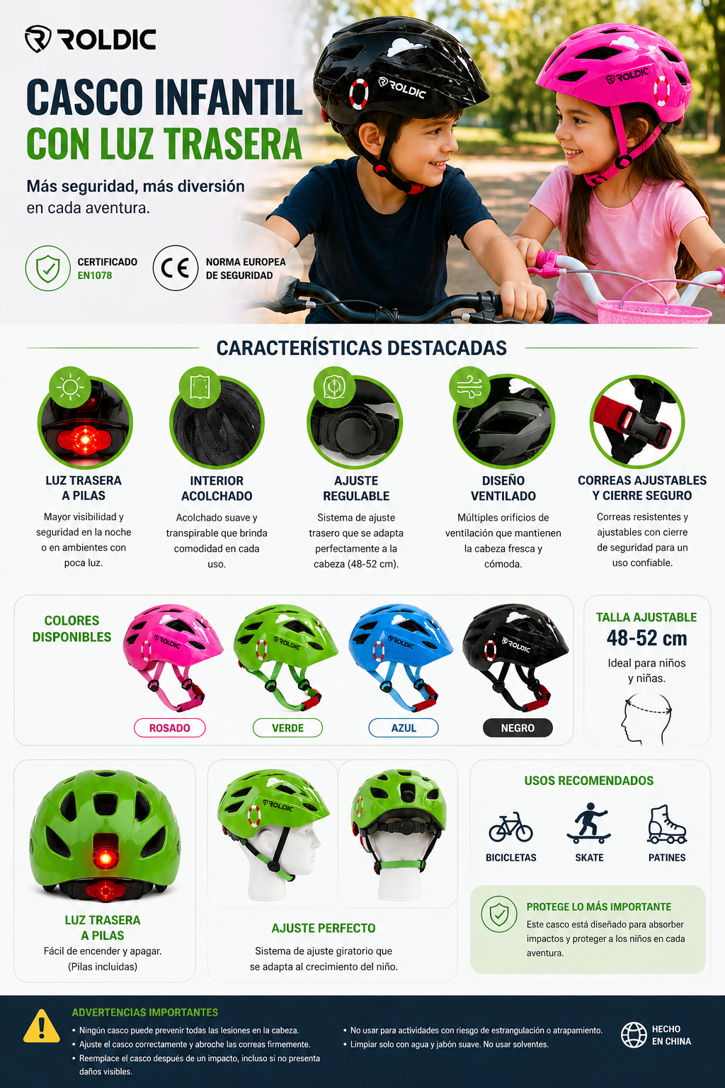- 🛡️ Certificación de seguridad: Cumple con norma europea CE EN1078 (uso en ciclismo, skate y patinaje)